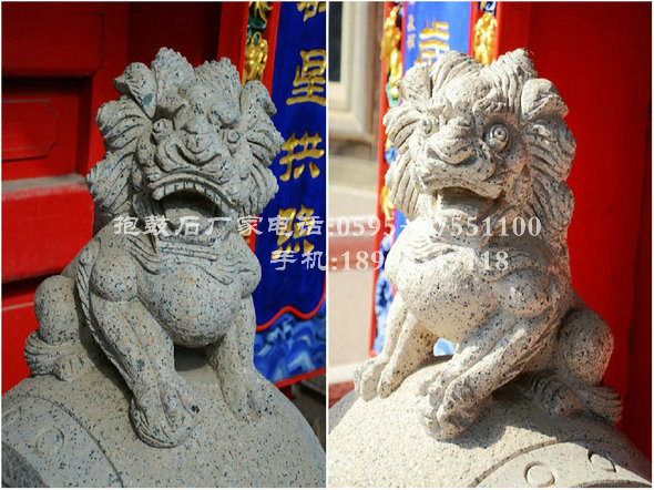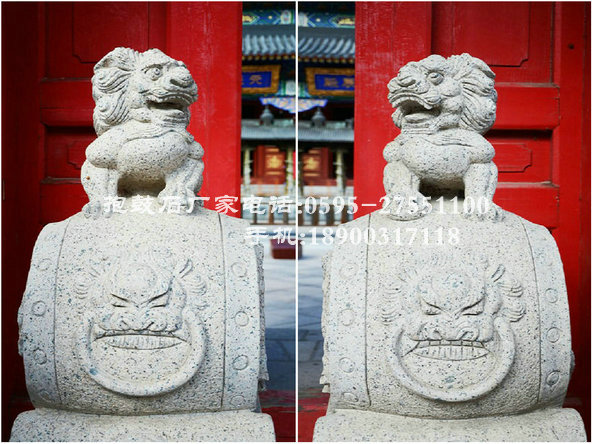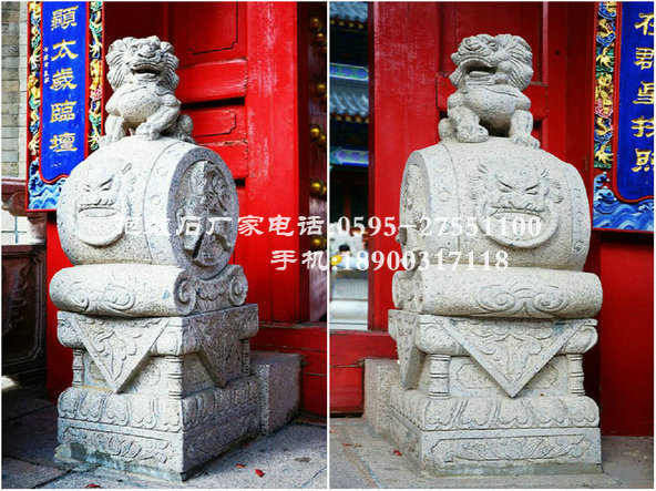 抱鼓石紋樣豐富多彩。鼓座上多浮雕牡丹、荷花、葵花以及如意紋、卷草紋、祥云紋等吉祥紋樣,寓意花好吉祥。鼓面雕刻常運(yùn)用淺浮雕與高浮雕結(jié)合的手法。因獅者為獸中之王,獅紋也成為抱鼓石最常見紋樣,以此顯示舊時(shí)豪門大戶的威嚴(yán)。 另外,鼓是法事專用的樂(lè)器,抱鼓石還可看作能夠驅(qū)邪避災(zāi)的法力象征,因而在佛寺、祠堂等大門兩側(cè)也常擺放抱鼓石。