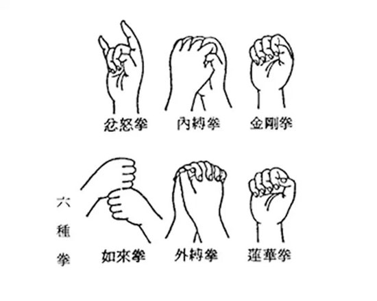 六拳包括金剛?cè)⑸徣A拳、內(nèi)縛拳、外縛拳、如來(lái)拳、忿怒拳。