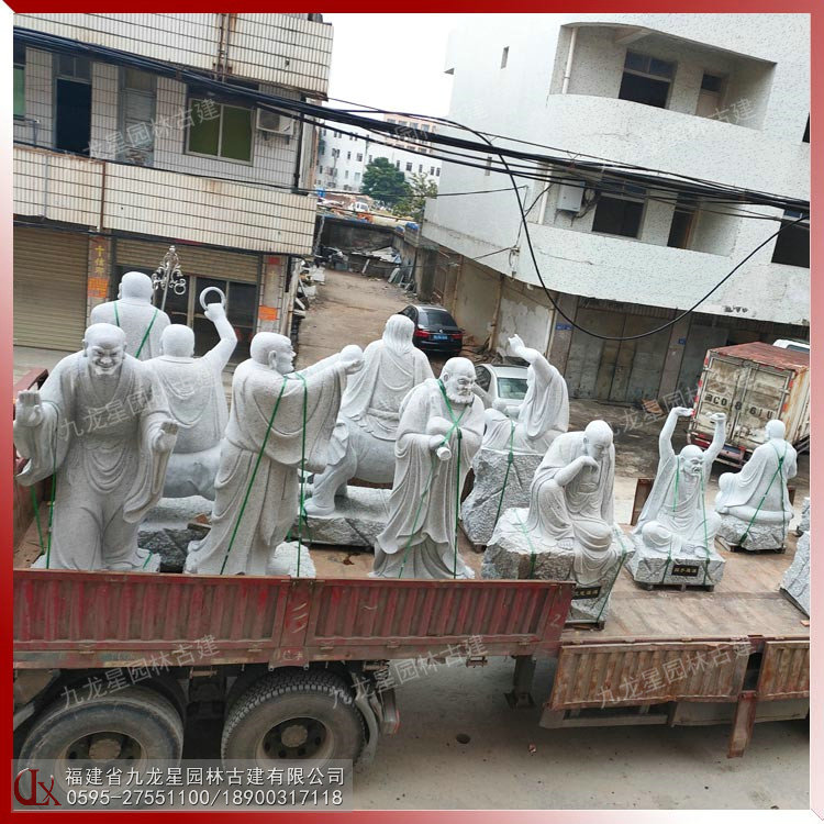 石雕十八羅漢雕塑一般采用天然石材加工制作而成,有花崗巖(芝麻白、芝麻黑、芝麻灰、蝦紅)、青石等,還有的則會用漢白玉石材制作。用于室外擺放石雕十八羅漢像通常建議用花崗巖石材雕刻,按順序擺放在兩側。